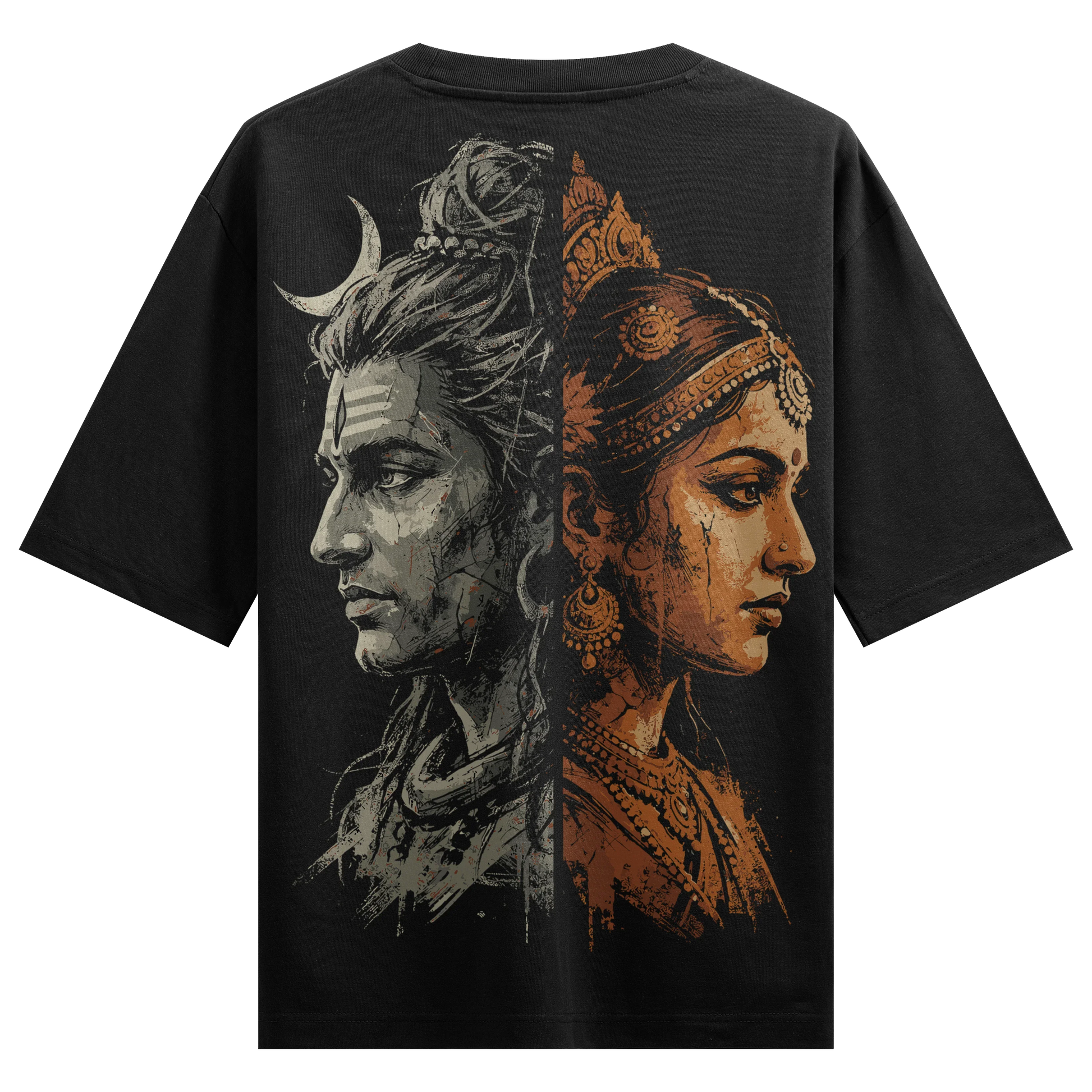 Split-face graphic featuring Lord Shiva and Goddess Parvati in contrasting grey and warm orange tones. Designed for those who celebrate the divine union of power and grace.