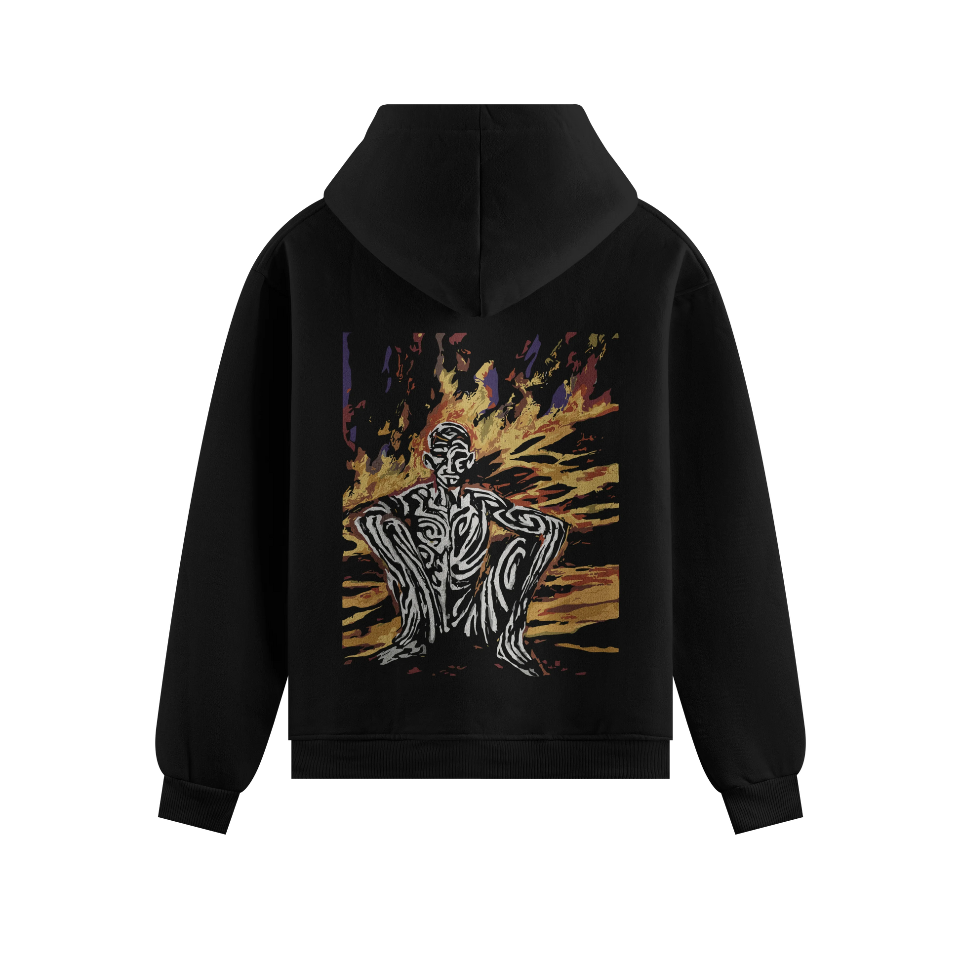 This piece features a tribal-marked figure seated before vibrant flames, symbolizing a trial by fire (Agni Pareeksha), designed for bold mythological streetwear.