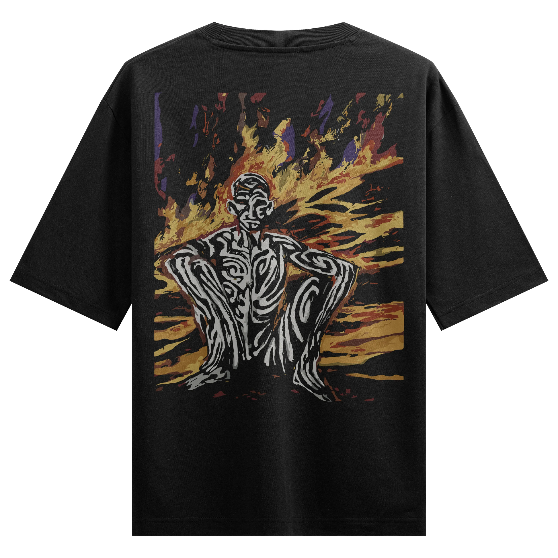 This piece features a tribal-marked figure seated before vibrant flames, symbolizing a trial by fire (Agni Pareeksha), designed for bold mythological streetwear.