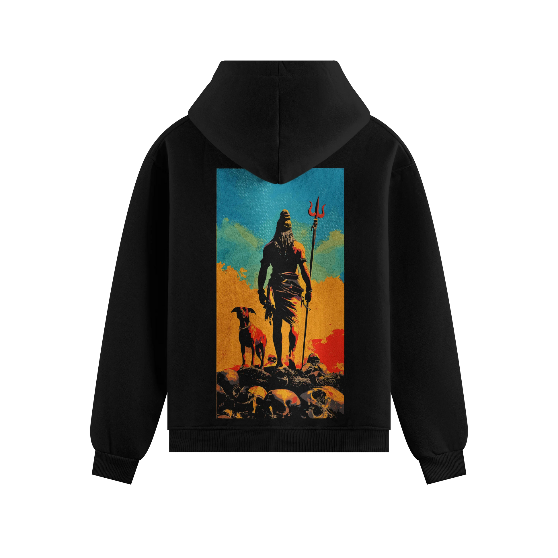 Bhairava with a loyal dog and trident standing atop skulls on a black oversized hoodie. Designed for those seeking fierce spiritual protection and powerful, artistic, and ancient cultural heritage.
