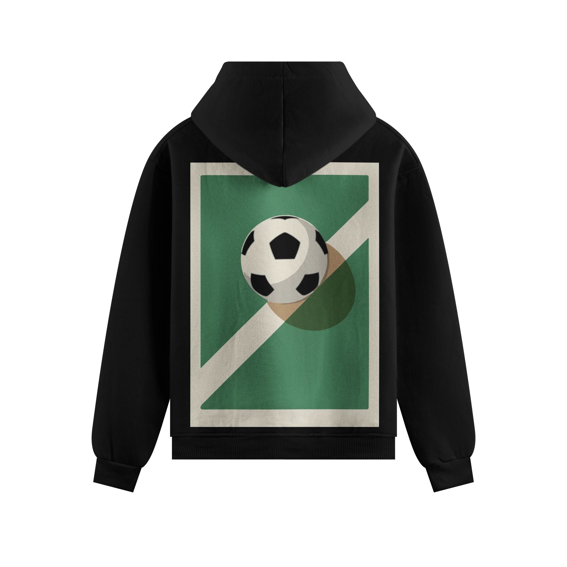 Stylized graphic of a football crossing a white goal line on a green field backdrop within a cream border.