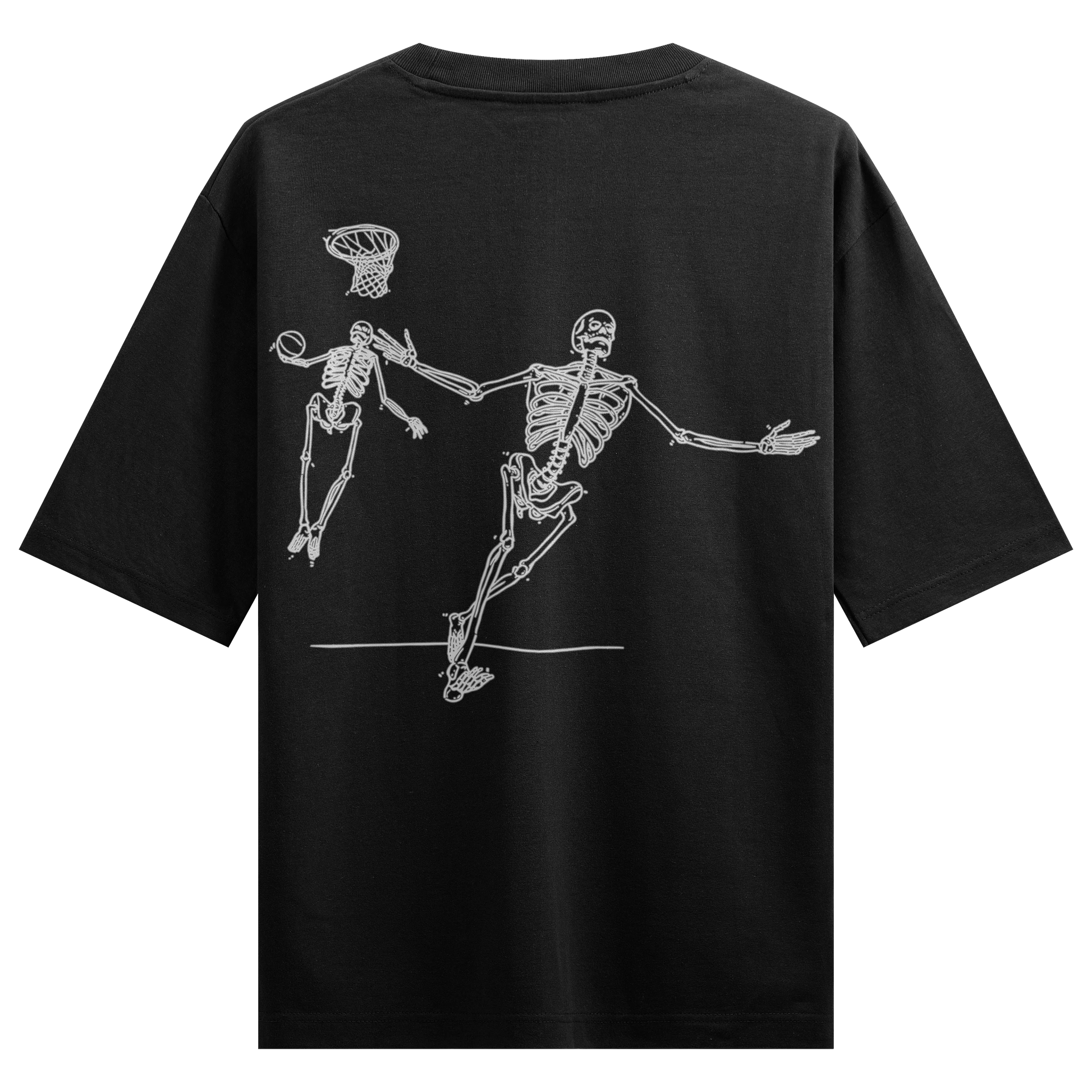 Minimalist white line art featuring skeletons playing basketball on a premium black oversized fit. Designed for athletes with a dark, edgy street style.