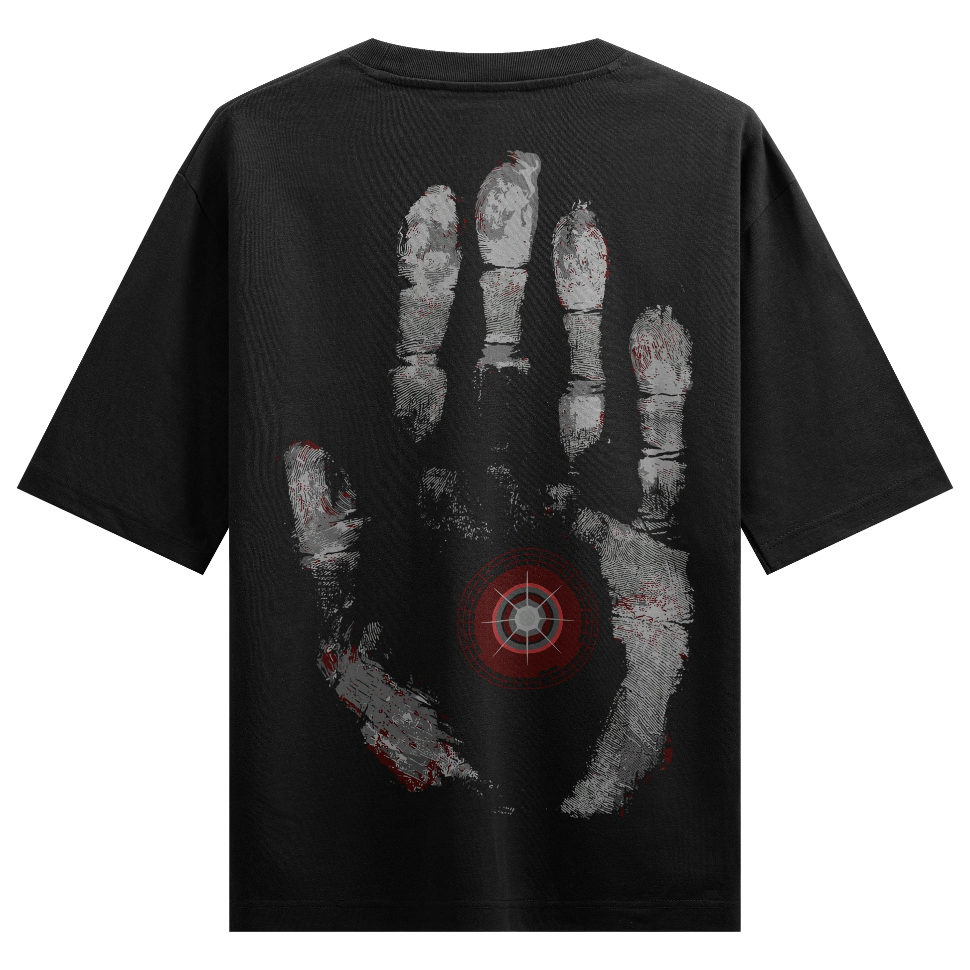 A giant, blood-stained palm print centers a precise target, symbolizing Ekāgratā (single-pointed focus). For those who demand intense concentration and absolute clarity.