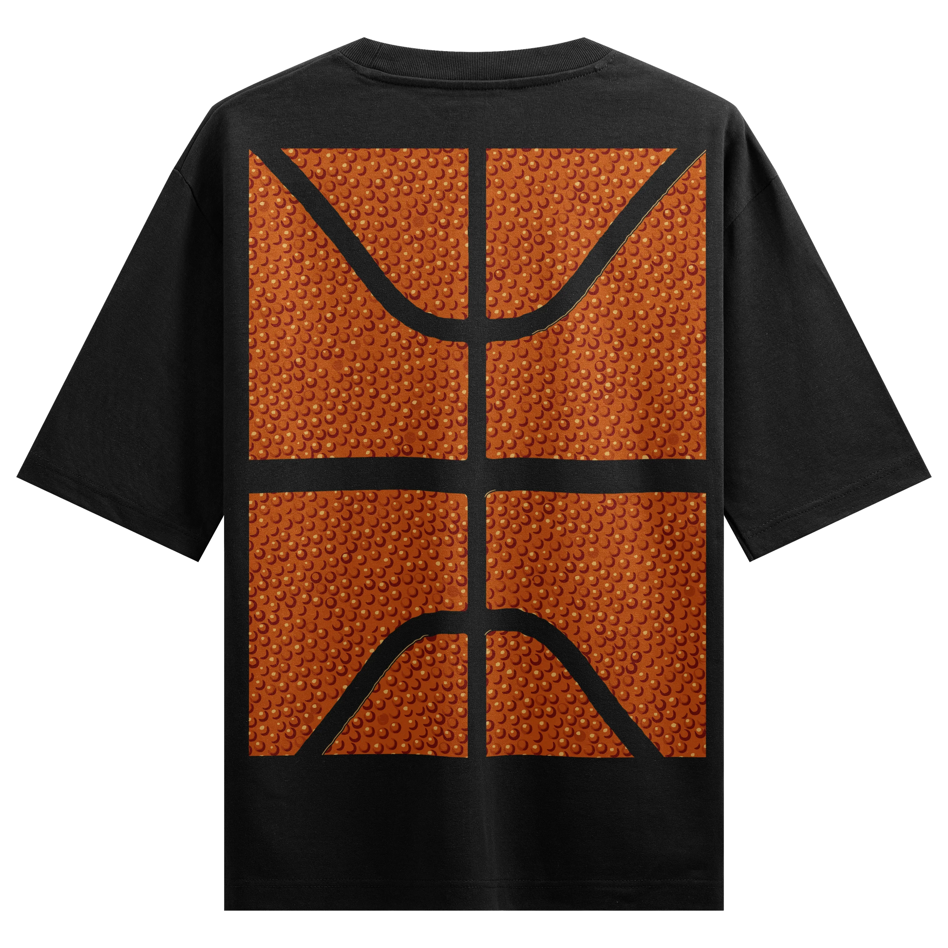 Large-scale graphic of a basketball's textured surface with bold black seams across a premium black oversized t-shirt. Designed for hoopers.