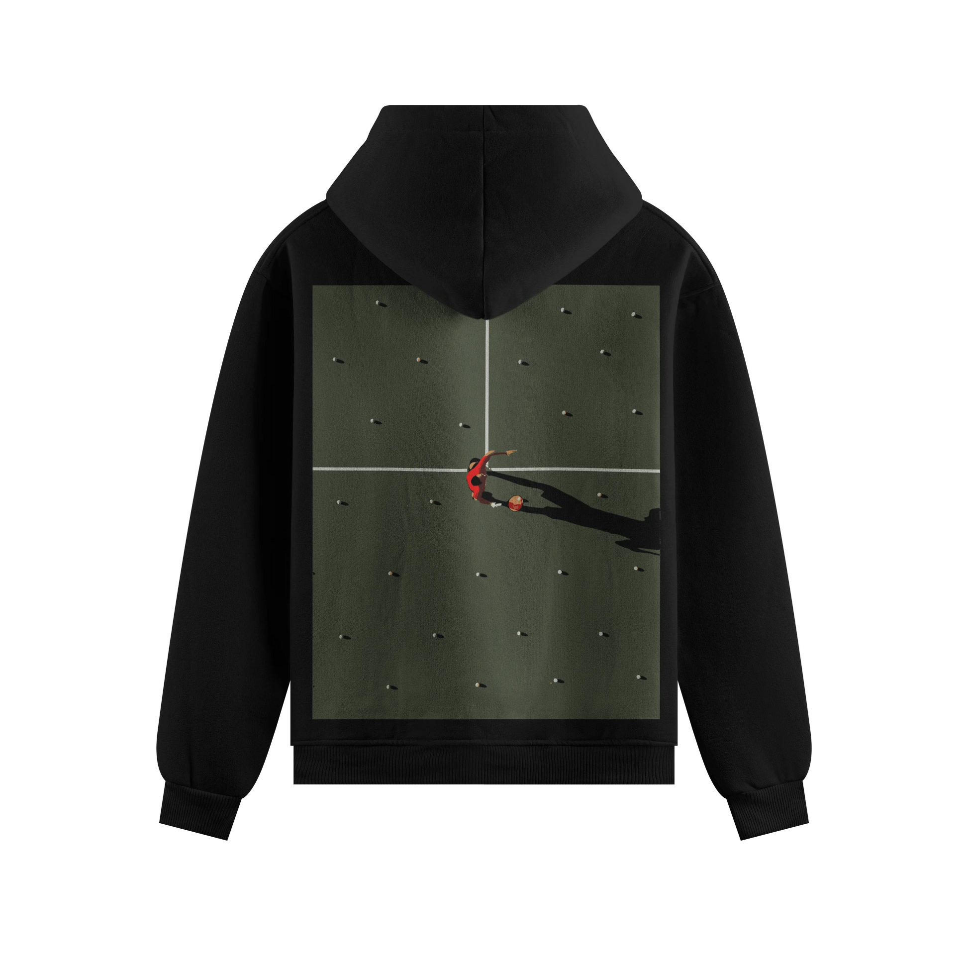 Top-down view of a player practicing drills on a green court scattered with basketballs on a black oversized fit. Designed for athletes dedicated to the grind of constant improvement.