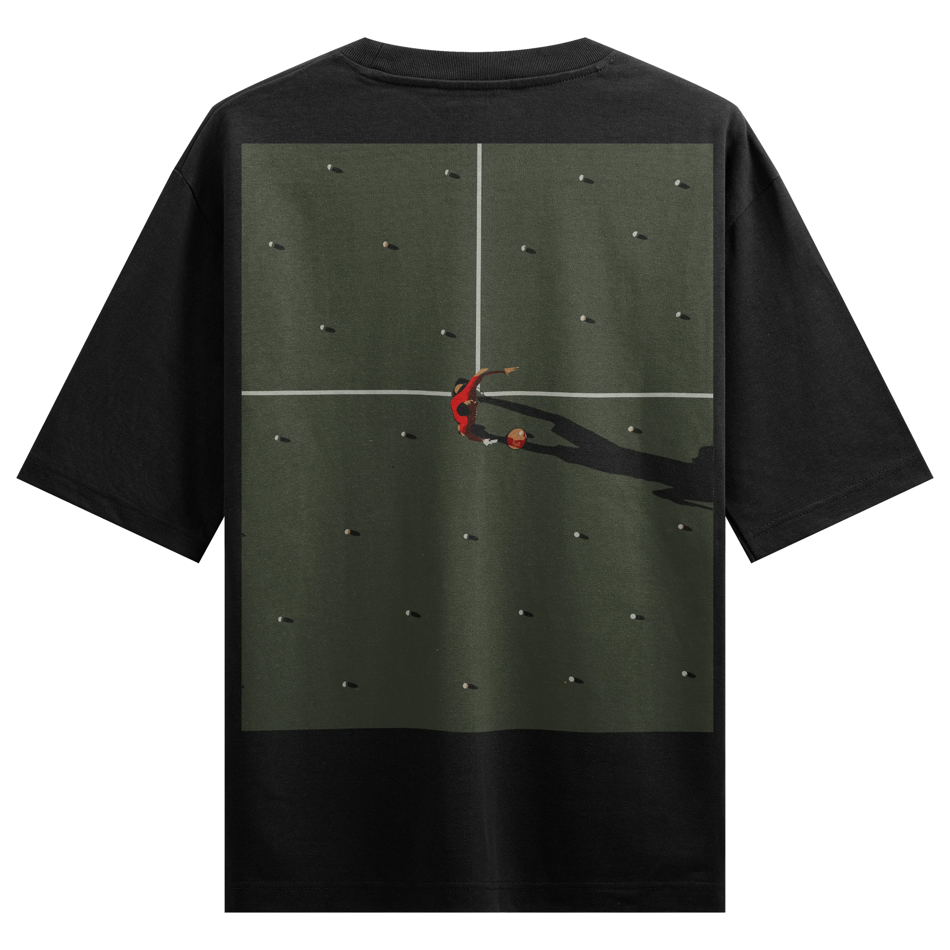 Top-down view of a player practicing drills on a green court scattered with basketballs on a black oversized fit. Designed for athletes dedicated to the grind of constant improvement.