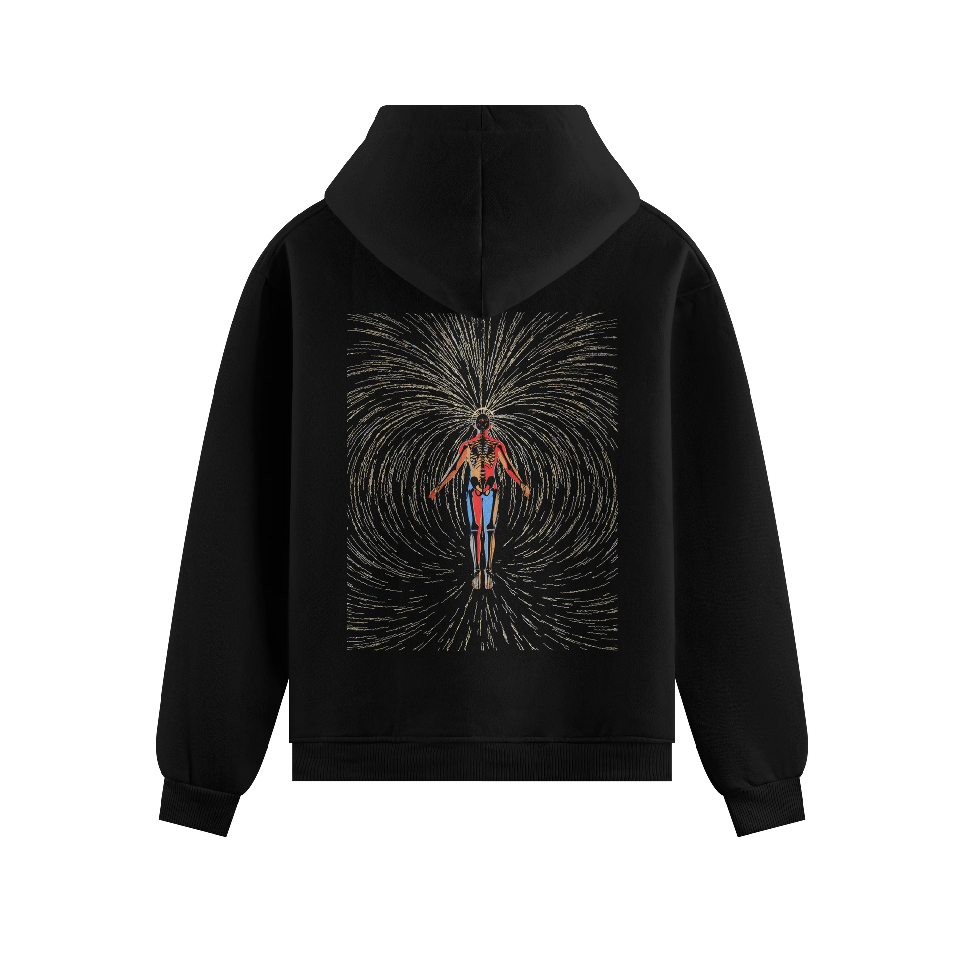 An illustrated human anatomy, color-coded and centered, radiates powerful golden frequency waves from the spine. For those who feel cosmic energy and inner resonance.