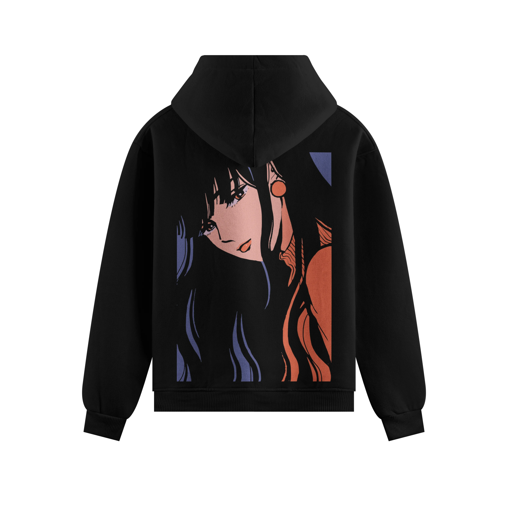 Close-up anime portrait featuring a girl with long dark hair and striking orange and purple highlights on black fabric. Designed for fans of vibrant, modern Japanese-inspired character art.