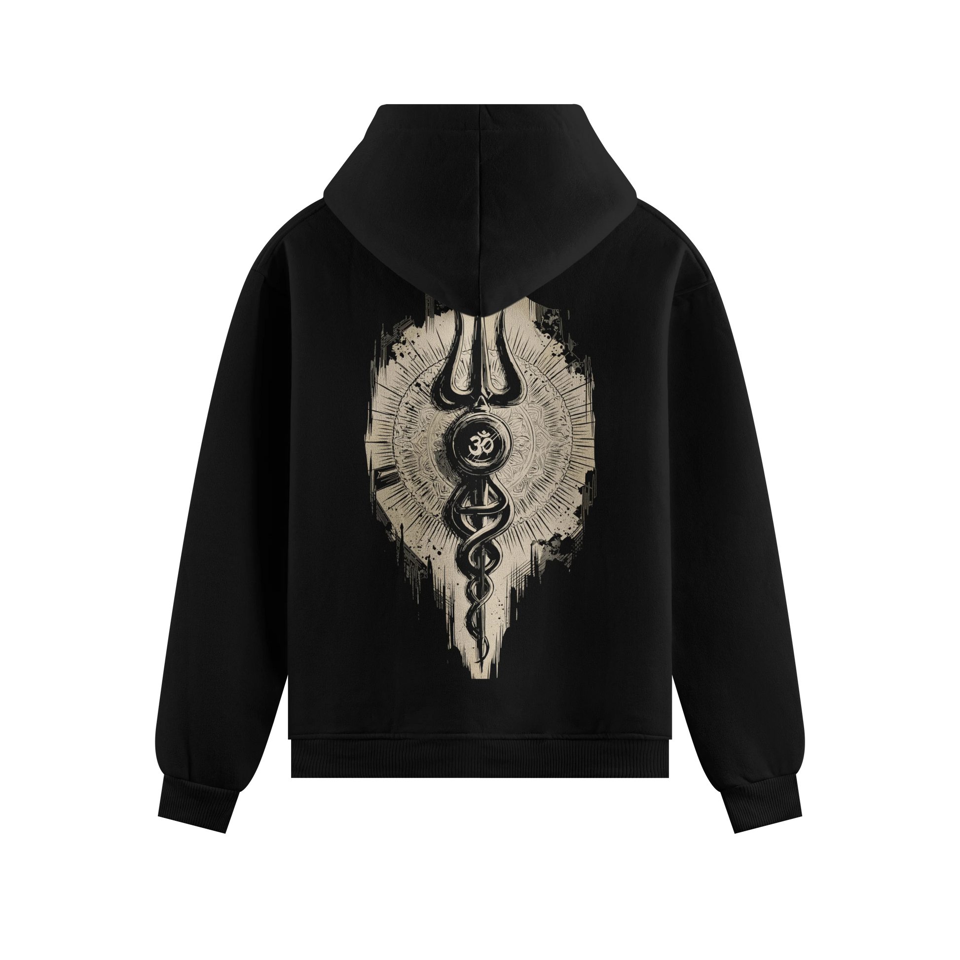 The Trishul and Om emblem, empowered by the coiling serpent, representing the invincible, mythical Naagastra weapon.