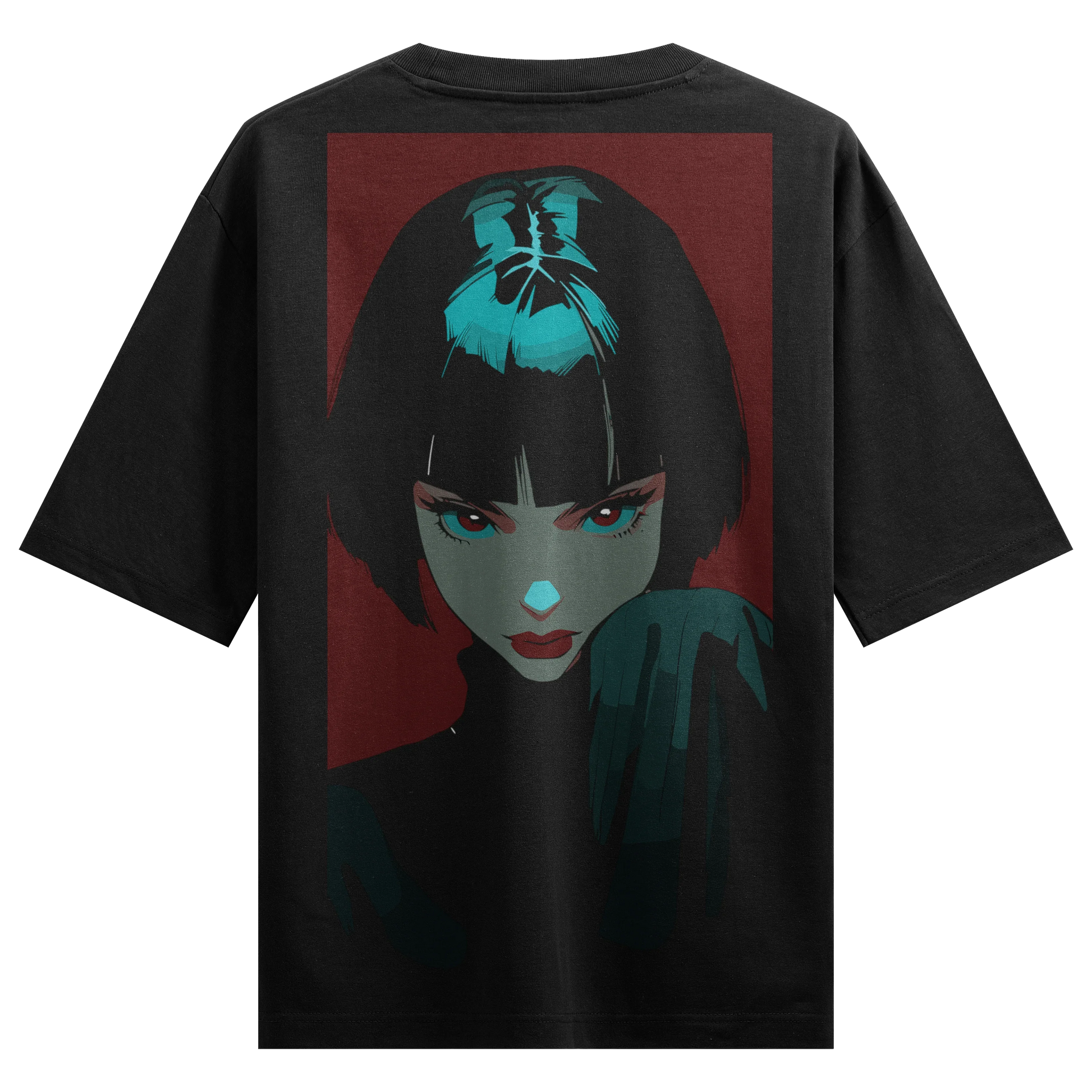 Stylized anime portrait featuring a girl with glowing cyan highlights and red eyes against a deep maroon background. Designed for fans of cyber-noir aesthetics.