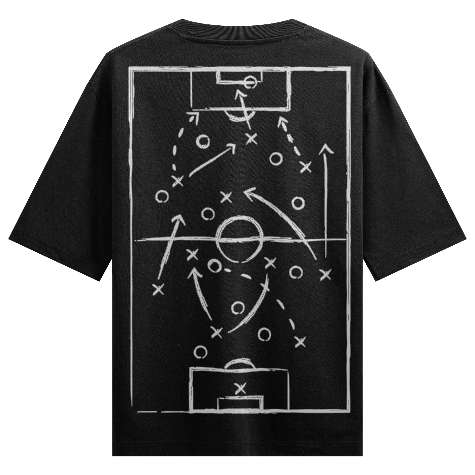 White chalk-style football tactical diagram featuring plays and player movements on a premium black oversized t-shirt. Designed for football tacticians.