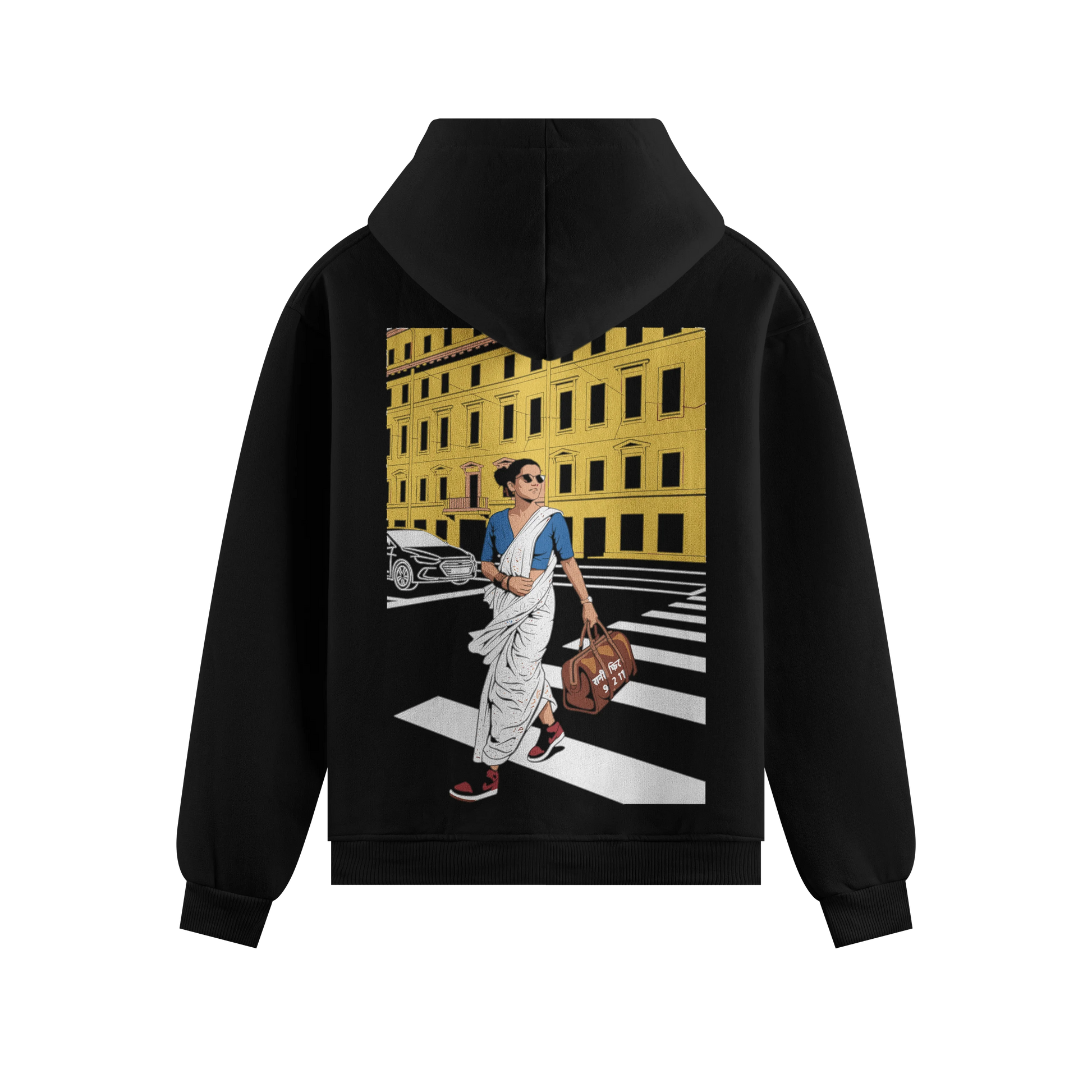 Vibrant graphic of a woman in a saree crossing a city street with a bag labeled "Rani". Designed for those blending traditional roots with modern urban flair.