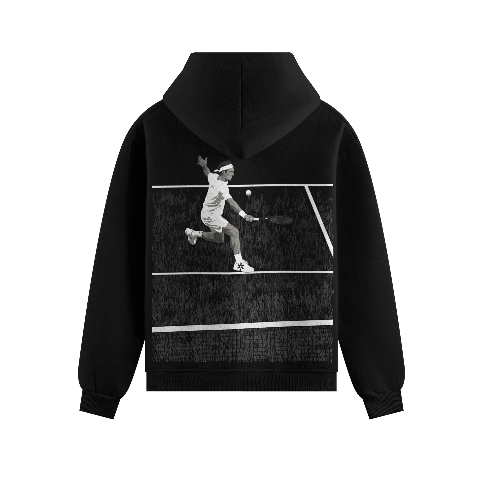 Monochrome action graphic of a tennis legend executing a powerful backhand on a textured grass court oversized tee. Designed for fans of classic sport excellence.