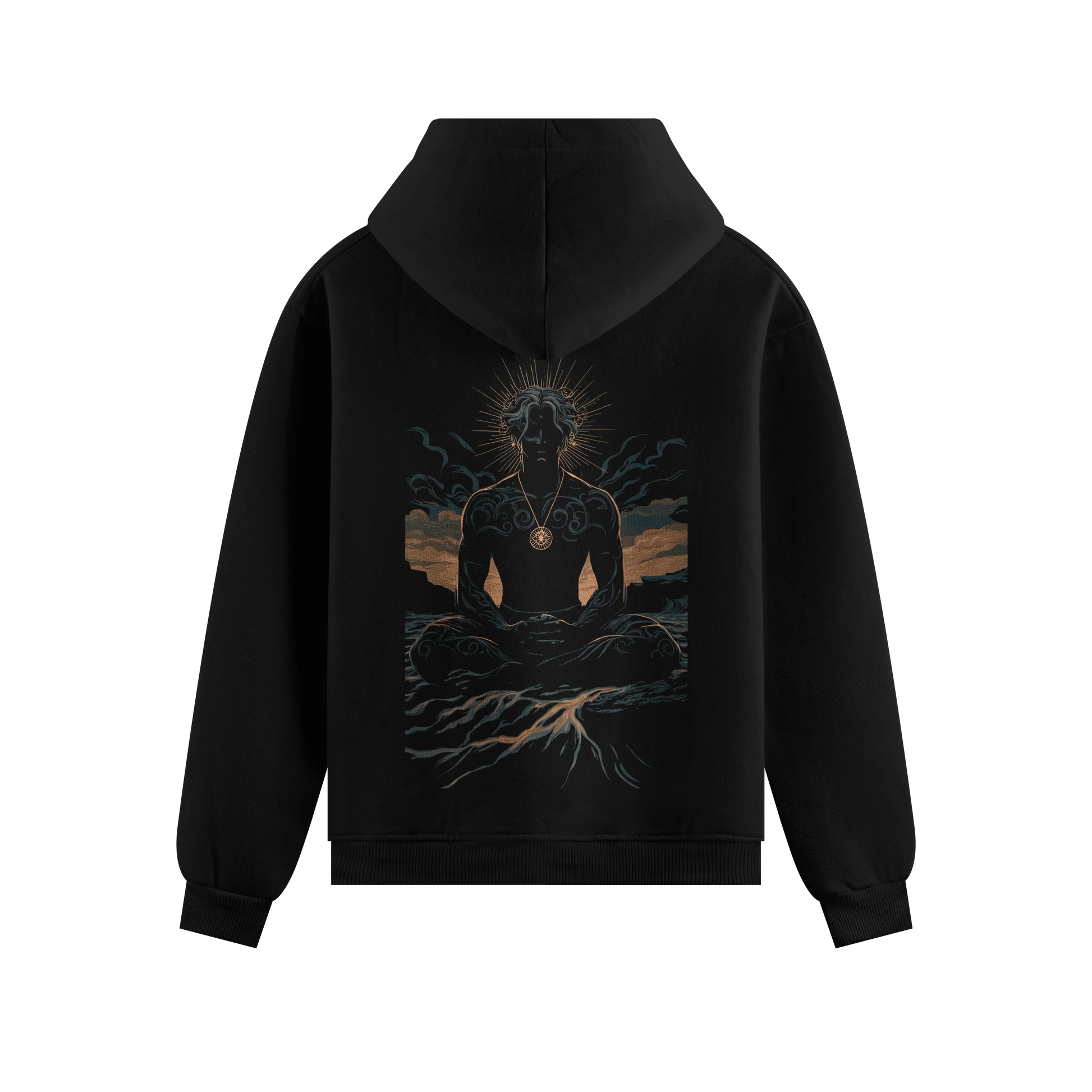 A meditating, tattooed figure with a solar pendant and halo is deeply rooted into the earth amidst a twilight landscape, seeking inner strength and grounding.