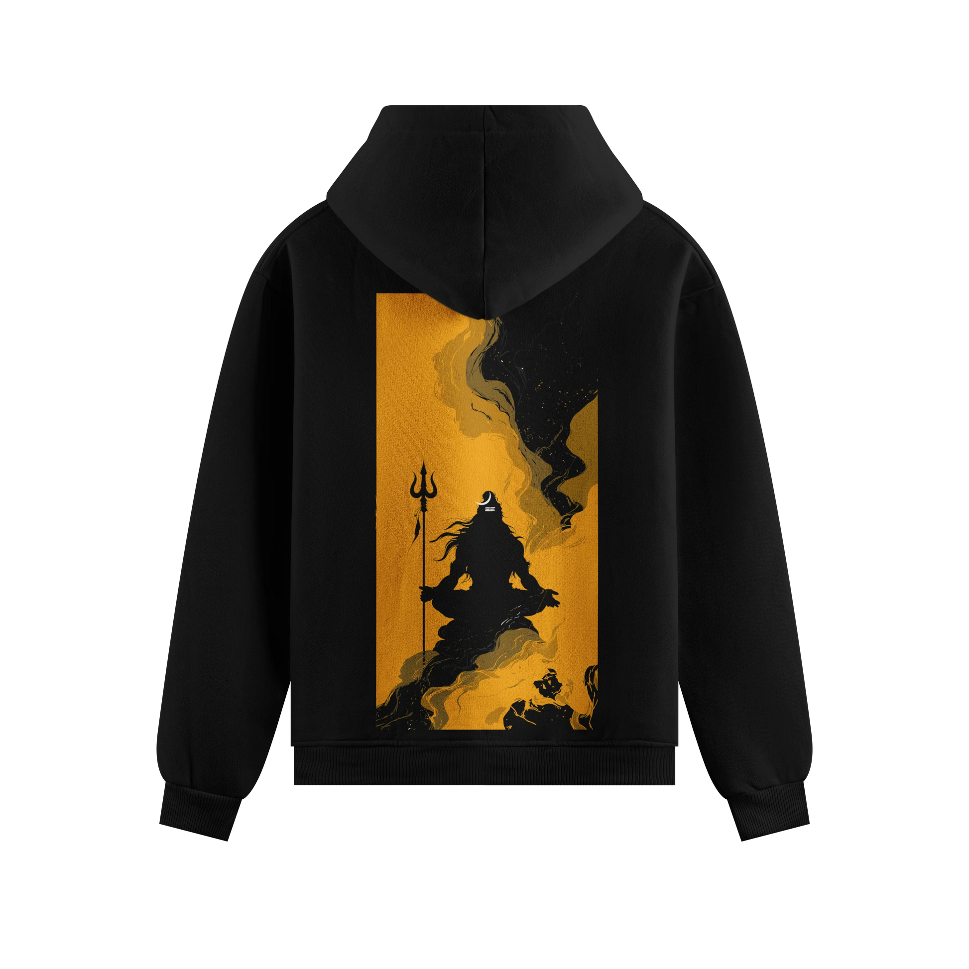 Shiva's silhouette with a trident against golden cosmic clouds on a black oversized hoodie. Designed for those seeking divine strength, spiritual peace, and powerful, artistic, cultural streetwear.