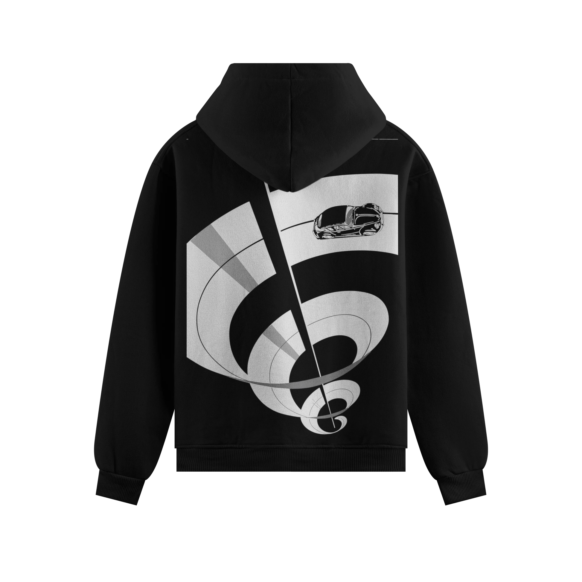 Monochrome graphic featuring a vintage car navigating a dramatic, swirling spiral track on a premium black oversized fit. Designed for automotive enthusiasts.