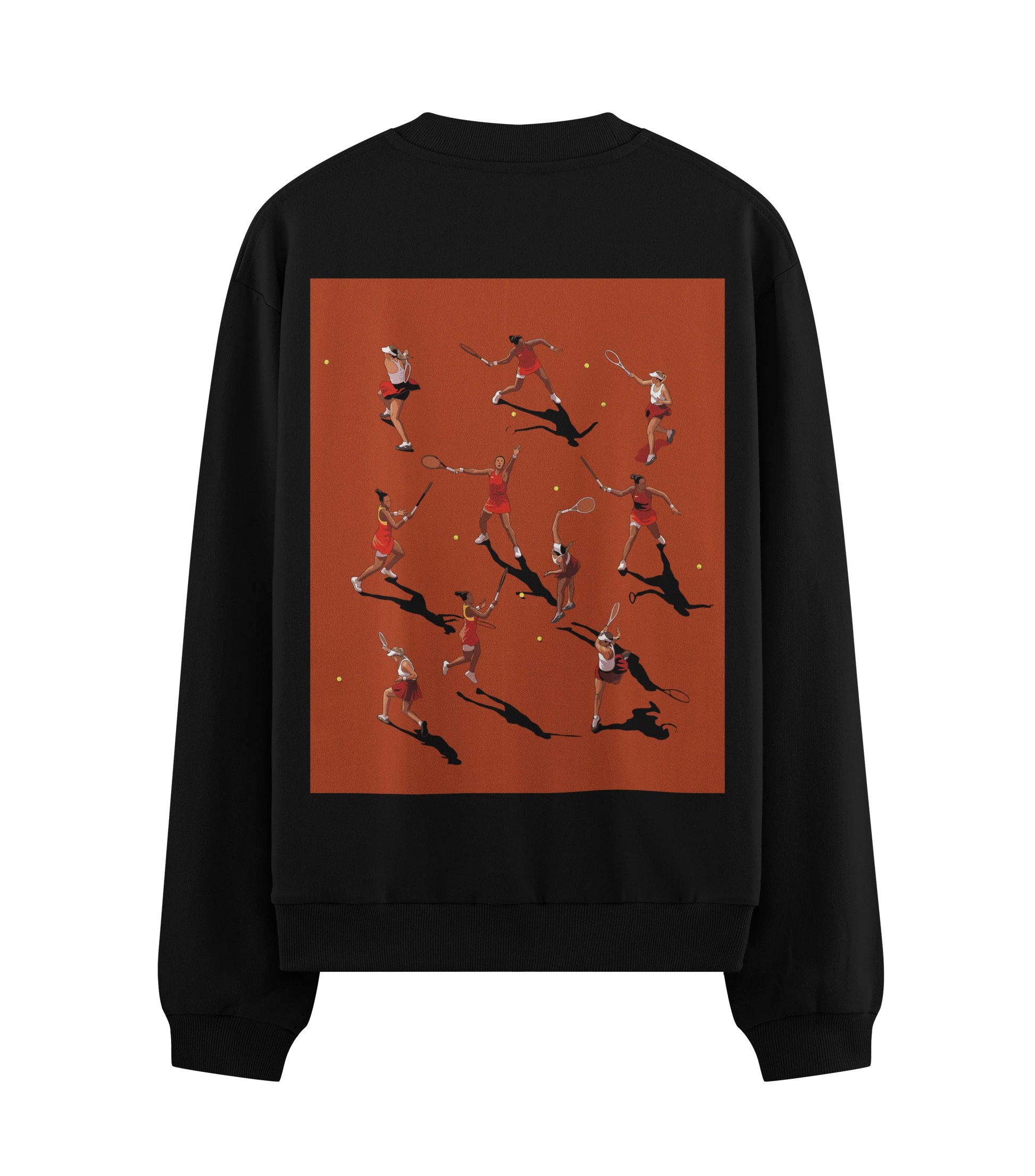 Dynamic collage of tennis players in various action shots against a clay-red background on a premium black oversized t-shirt.