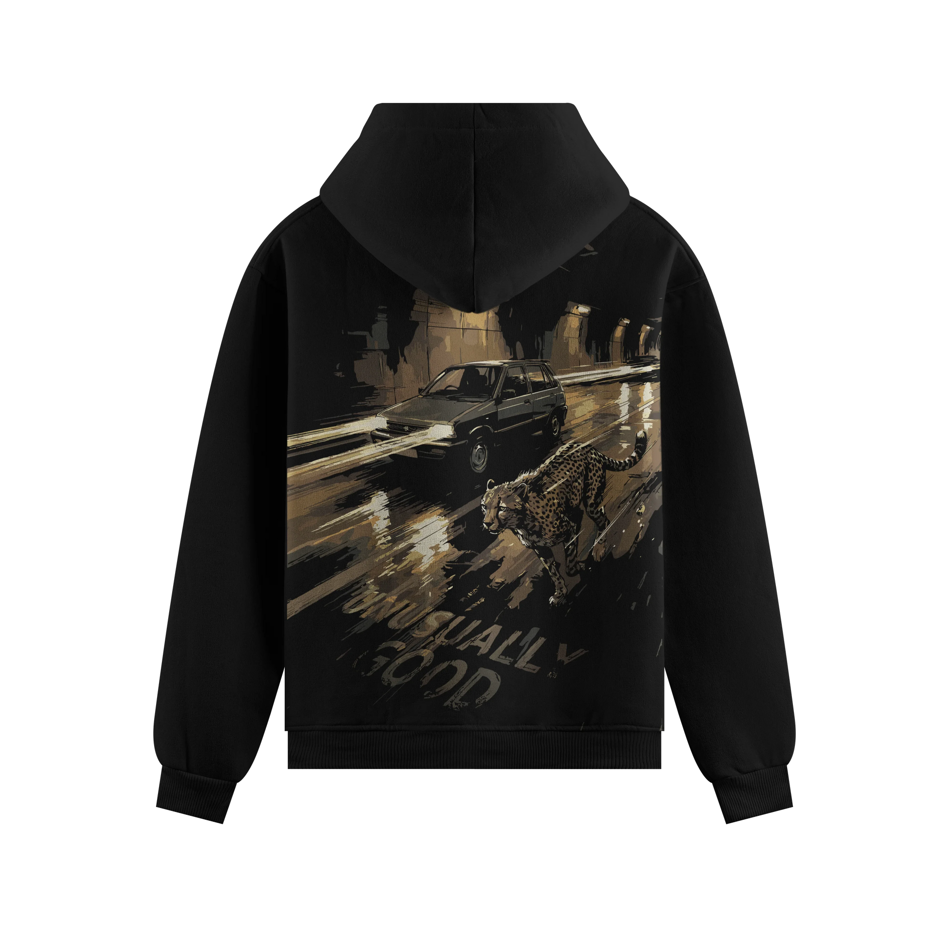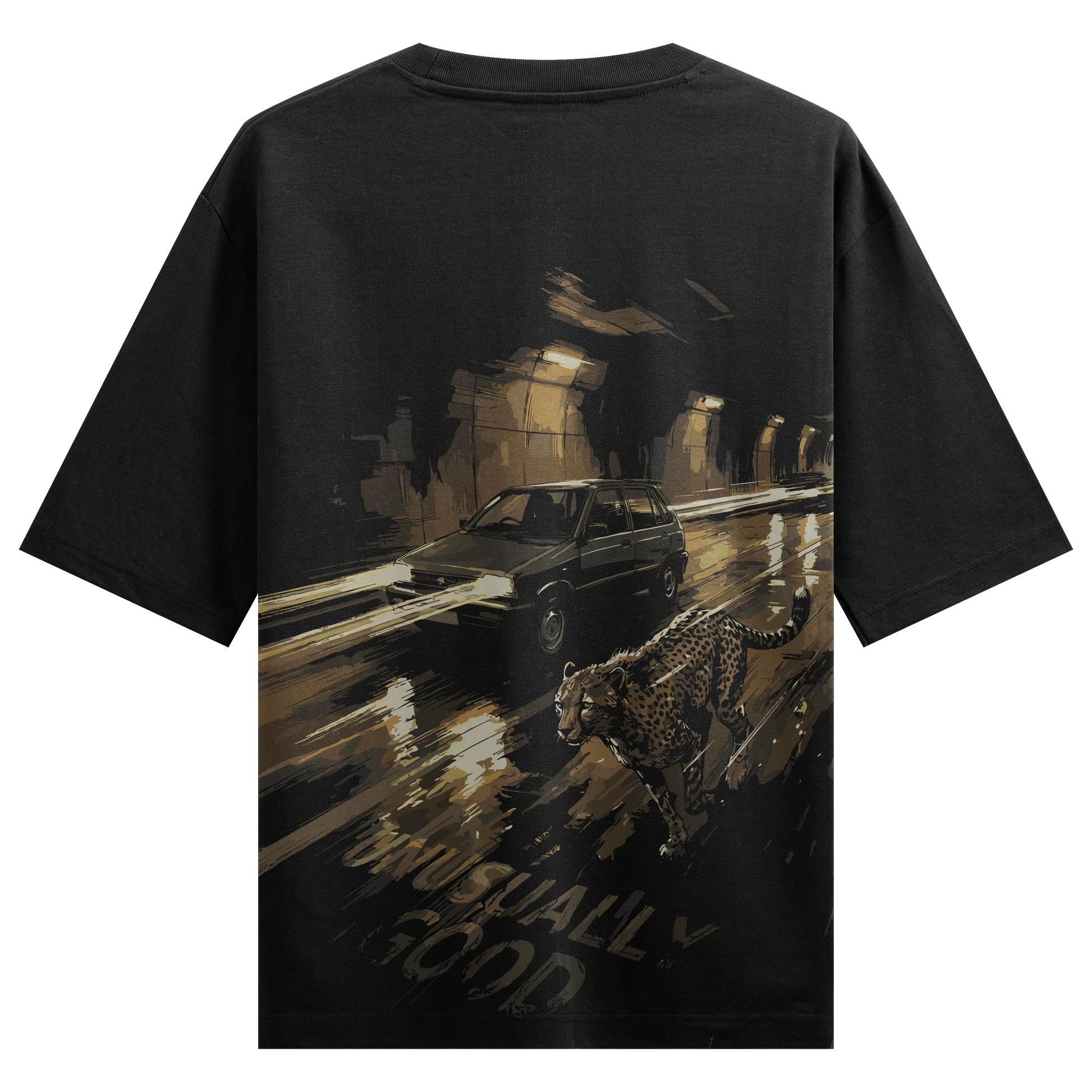 A leopard races a hatchback in a wet, dark tunnel. For those who live for raw speed and the unusually good chase.