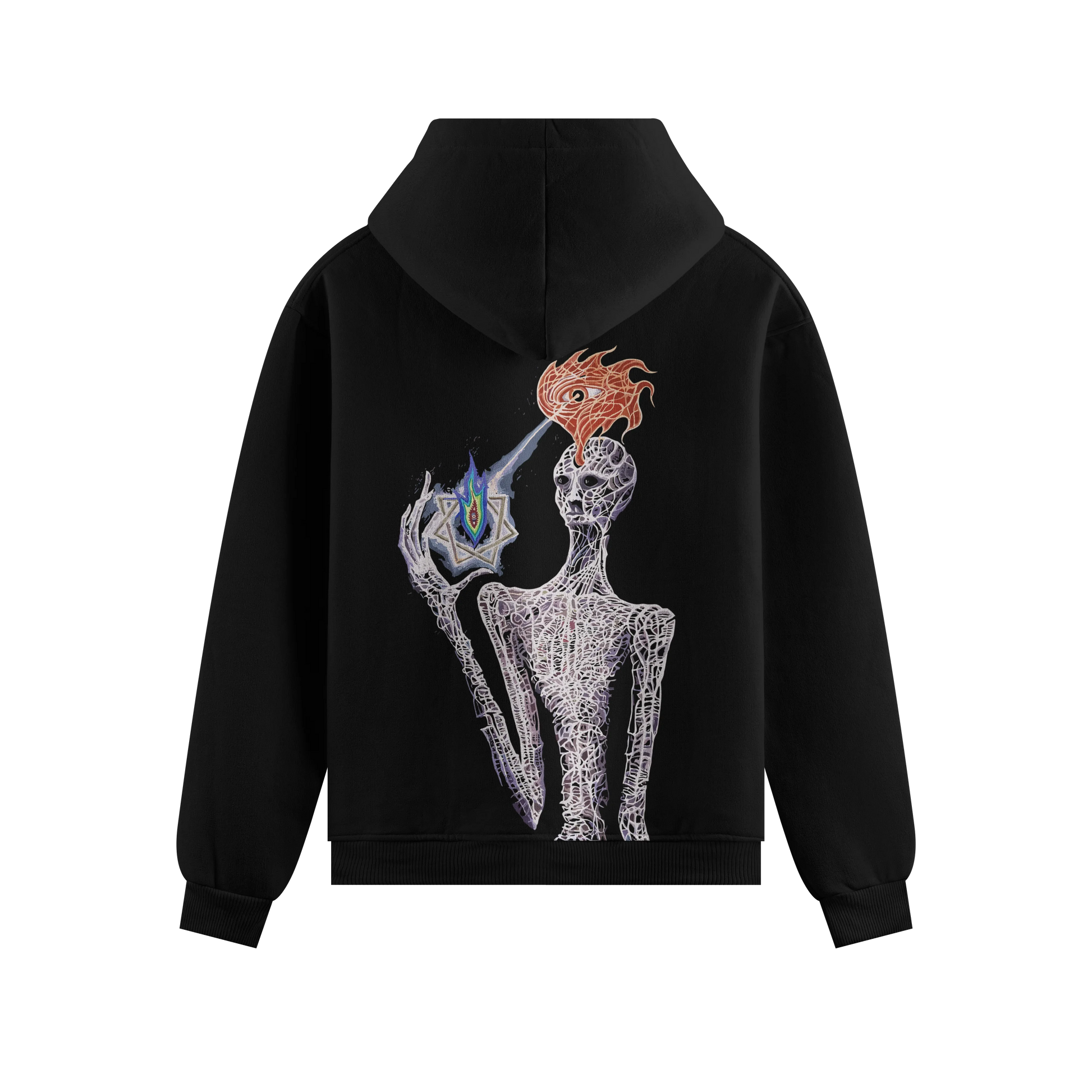 A skeletal, ethereal figure holds an energy star while a fiery, winged Third Eye projects a laser beam of focus. For those embracing digital enlightenment.